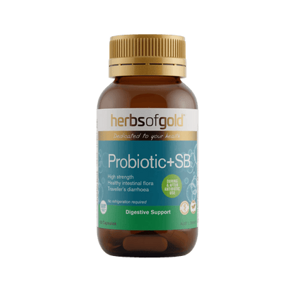 Herbs of Gold Probiotic + SB supports digestive health by restoring friendly intestinal flora and maintaining mucosal membrane health. It contains high-strength Saccharomyces boulardii to help reduce the occurrence and symptoms of traveller’s and antibiotic-associated diarrhoea. The probiotics survive stomach acid, support immune health, and can be taken during and after antibiotic use.