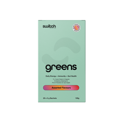 Switch Nutrition Greens is a nutrient-rich superfood blend designed to support overall health and vitality. Packed with organic greens, antioxidants, vitamins, minerals, and digestive enzymes, it helps boost energy, improve gut health, and support detoxification. With over 15 super greens and vegetables, four serves of native fruits, energising adaptogens, plus prebiotics, probiotics, and digestive enzymes, it delivers a powerful blend for daily wellness.